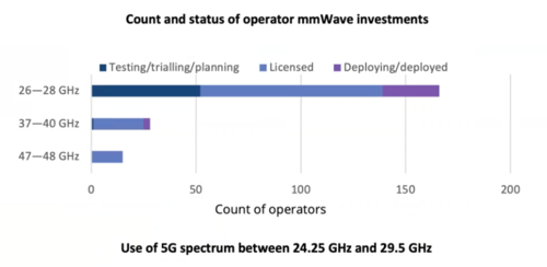 【概要描述】GSA总裁Joe Barett分享的数据显示,目前已有48个国家的186家运营商正在26-28GHz、37-40GHz和47-48GHz的毫米波频谱上规划发展5G,23个国家的134家运营商持有许可证,可以进行毫米波部署,北美、欧洲和亚洲占据所有频谱部署的75%。
