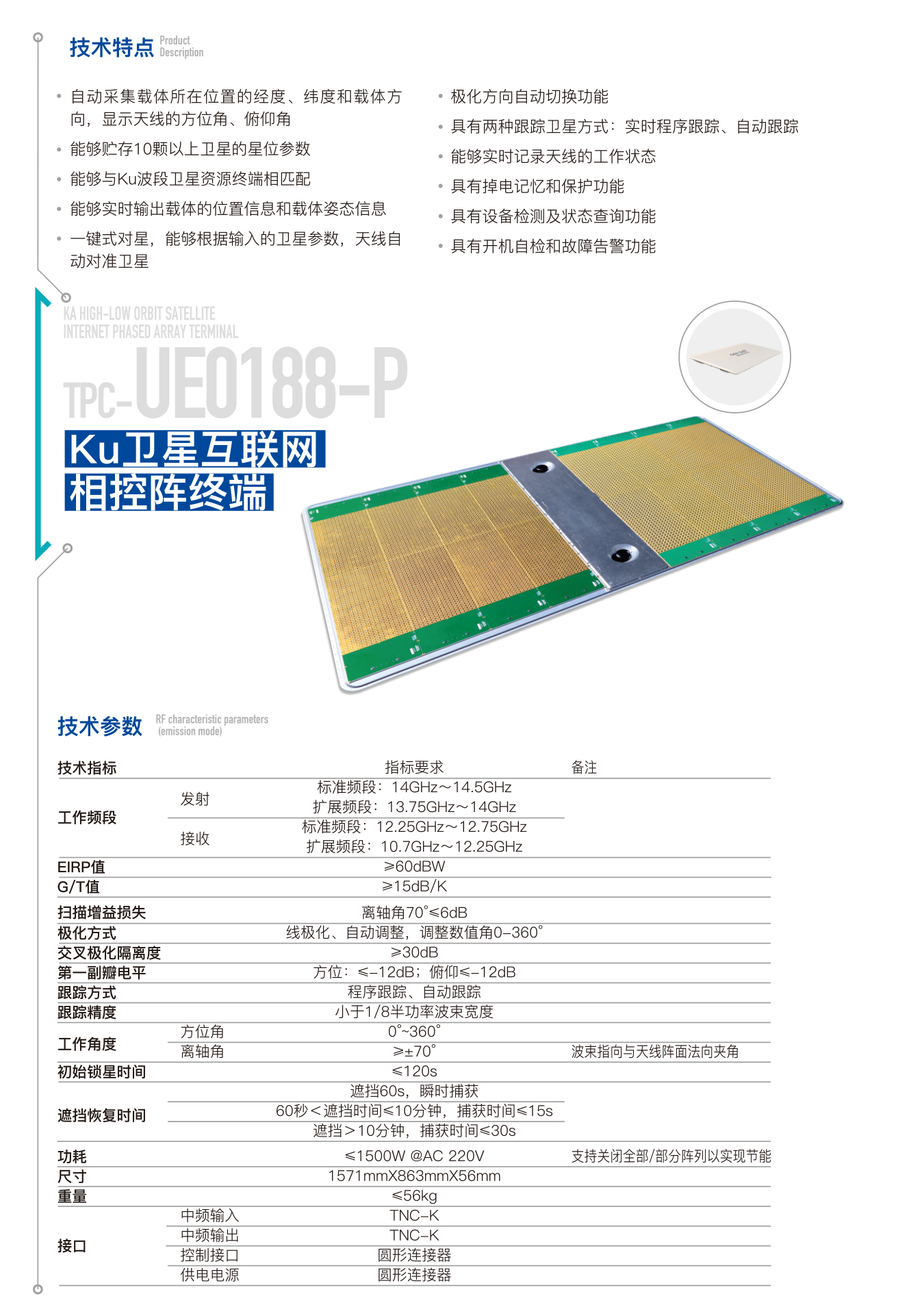自动采集载体所在位置的经度、纬度和载体方向显示天线的方位角、俯仰角 能够贮存10颗以上卫星的星位参数 能够与Ku波段卫星资源终端相匹配 能够实时输出载体的位置信息和载体姿态信息 一键式对星,能够根据输入的卫星参数,天线自动对准卫星 极化方向自动切换功能 具有两种跟踪卫星方式:实时程序跟踪、自动跟踪 能够实时记录天线的工作状态 具有掉电记忆和保护功能 具有设备检测及状态查询功能 具有开机自检和故障告警功能